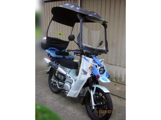 主観、私感、自画自賛で恐縮ですが、 やはりハンターカブのアップマフラーは外観に躍動感が出てる気がします。 下写真1はノーマルマフラー時の写真です。 風雨除け透明エプロンですが、晴天時には巻いて、シールド下部内側にクリップで止めています。