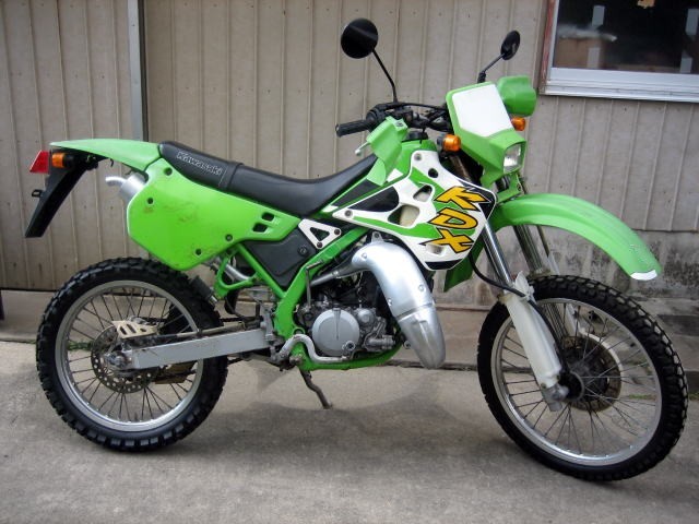 KDX125SR (グラフィックシールから見て、多分最終型?) この車体は長年軒先で雨ざらしだったのを、馴染みの店が買い取った物で そのままの状態で店先に置いてありました。 プラ製外装の緑色が各所で色あせ、 サイドカバーのゼッケンを付ける箇所に貼…
