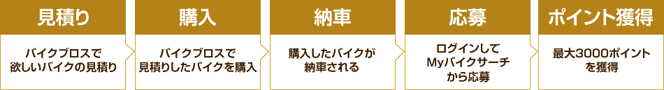 応募条件を満たした応募者から、毎月先着300名様にお見積したバイクの車両本体価格(お見積り時の表示価格)の1%分をプレゼント(最大 3000ポイント)
