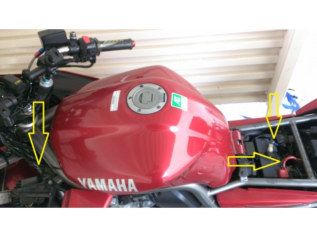 明日(6月28日)下取りで引き渡すヤマハFZS1000フェザーについているシガーソケットの移設と配線変更とナビの電源ケーブル取り外しとクランプマウントの取り外しを行いました。 クランプマウントはバーハンドルに付いているのを外すだけですが…
