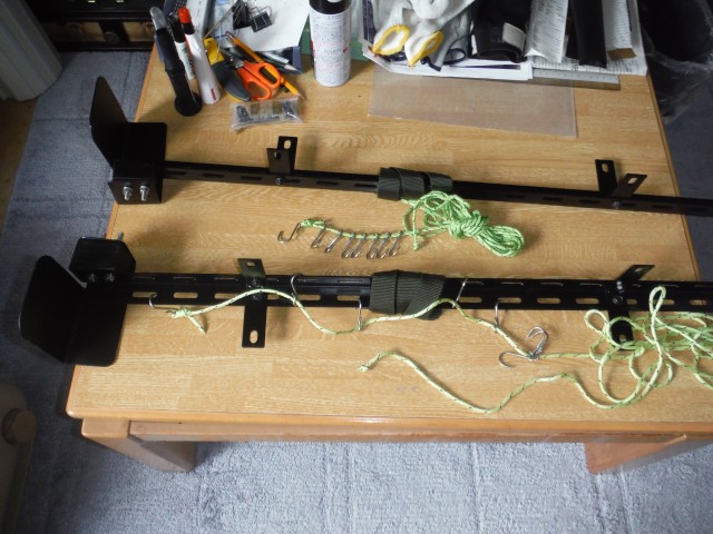 縦積み積載の機具です。L型アングルとL金具が2箇所と途中にカーキ色ベルト、黄緑色のロープとSフック8個。 Sフックの片方は輪を絞り込んで抜けないようにして、黄緑ロープを自由にスライド出来るようにしました。これが積載時に威力を発揮します。 L…