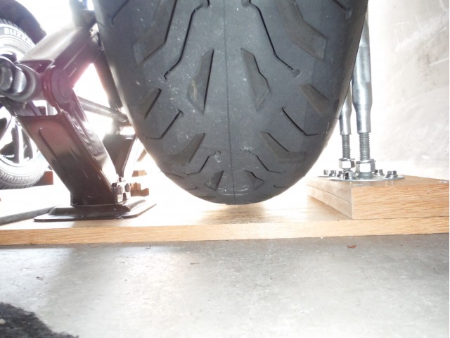 チエーンメンテを簡単にする簡易器具を作ってみました。メンテナンススタンドの代用でジャッキの応用です(^_-)-☆ バイク後輪を簡単にジャッキアップしてタイヤを浮かすことができます。 メイン写真はタイヤが完全に浮きました( ^^) _U~~ タイヤがフリーに…