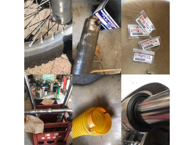 セローのフロントフォークからオイル漏れ。まず分解して状況観察。 ドレンボルトからの漏れだと思っていたらオイルシールからの漏れだったので、 フルオーバーホールを選択。内部消耗品は総交換、部品代13000円ぐらい。