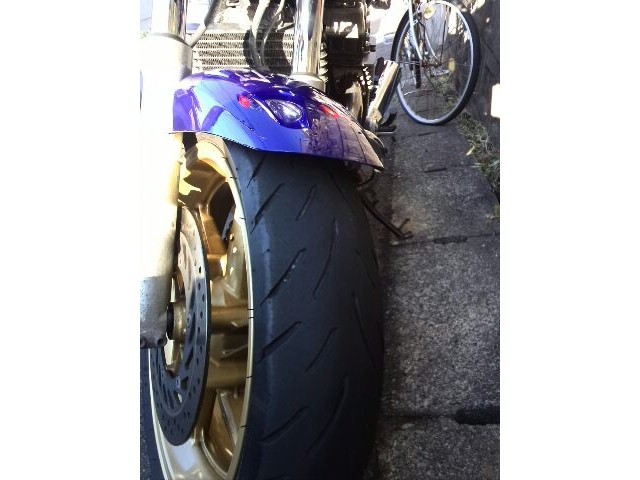 このバイクに乗り始めて3回目のFタイヤ交換。 スリップサインが出て来たので今回はちょっと早めの交換だ。 第一の理由はボーナス月じゃないと変えられないから!(^^; 夏までは持ちそうもないのでね。(笑)