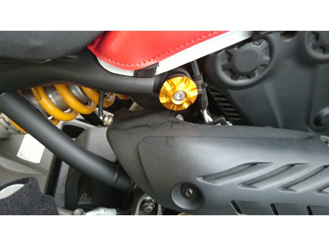 BABY FACEのフレームキャップです。モンスター821/1200用、品番005−D0024GDです。 色味は同社のアルミ製品らしいオレンジの強いゴールドで、質感も高くインパクトは抜群です。 はめ込むのがかなりきつかったので、取り付けはショップにお願いしました。