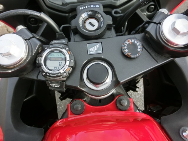超小型の温度計とコンパス(方位計)を両面テープで取り付け 超小型の高度計を探しましたが、サイズの大きいものしかなかったので カシオの高度計付き腕時計を取り付けました。 高度計はデジタル表示です。 バイクがどの方向に進んでいるのか 高度はど…