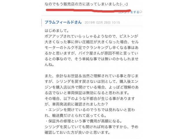 「保証使おう!」、「既に販売店に送ってしまった」との事だったので写真のようなコメントをしたのだが気に触ってしまったようです。コメント削除の上、本文は"保証切れは知ってた"、みたいな内容に書き換えられてました。その後メッセでお礼送られても、コメントが無かった事にされてちゃねぇ。