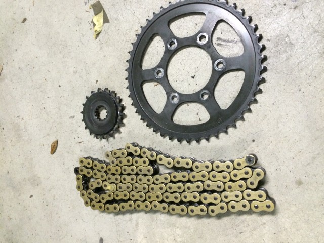 純正の前後スプロケ、チェーン見た目は綺麗だけど新品と比べると減っていた。