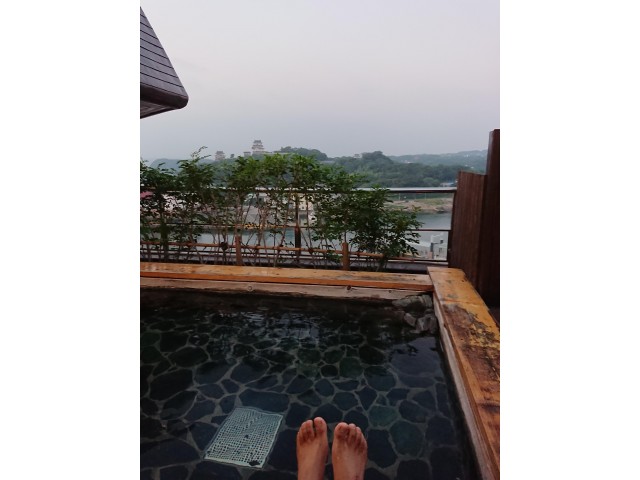 こらこら!、朝からお風呂なんて、、、なんと贅沢な、、、。♪ 、、で、遠くの城、、、どこだろう?。(小さくて良く見えない)